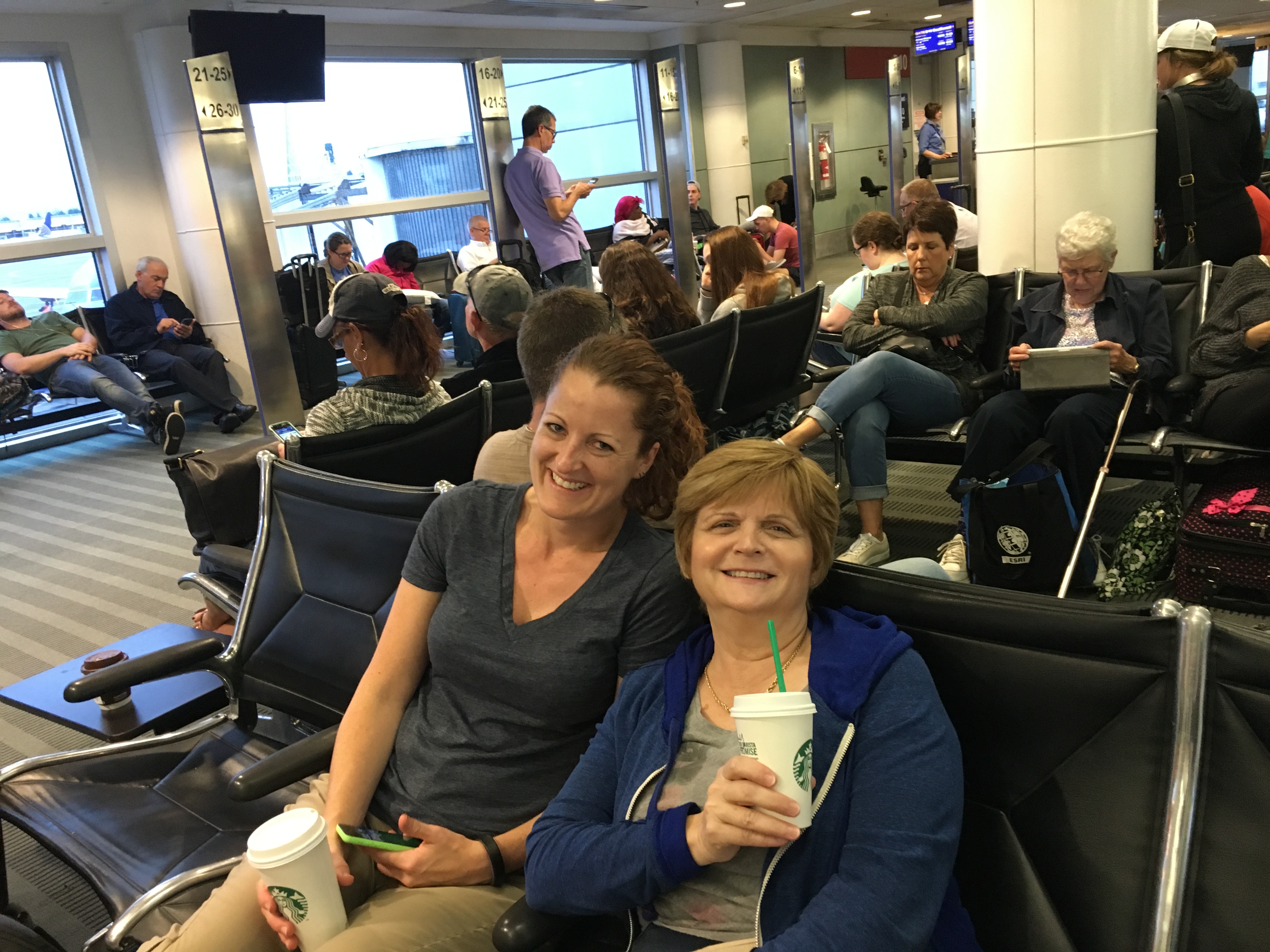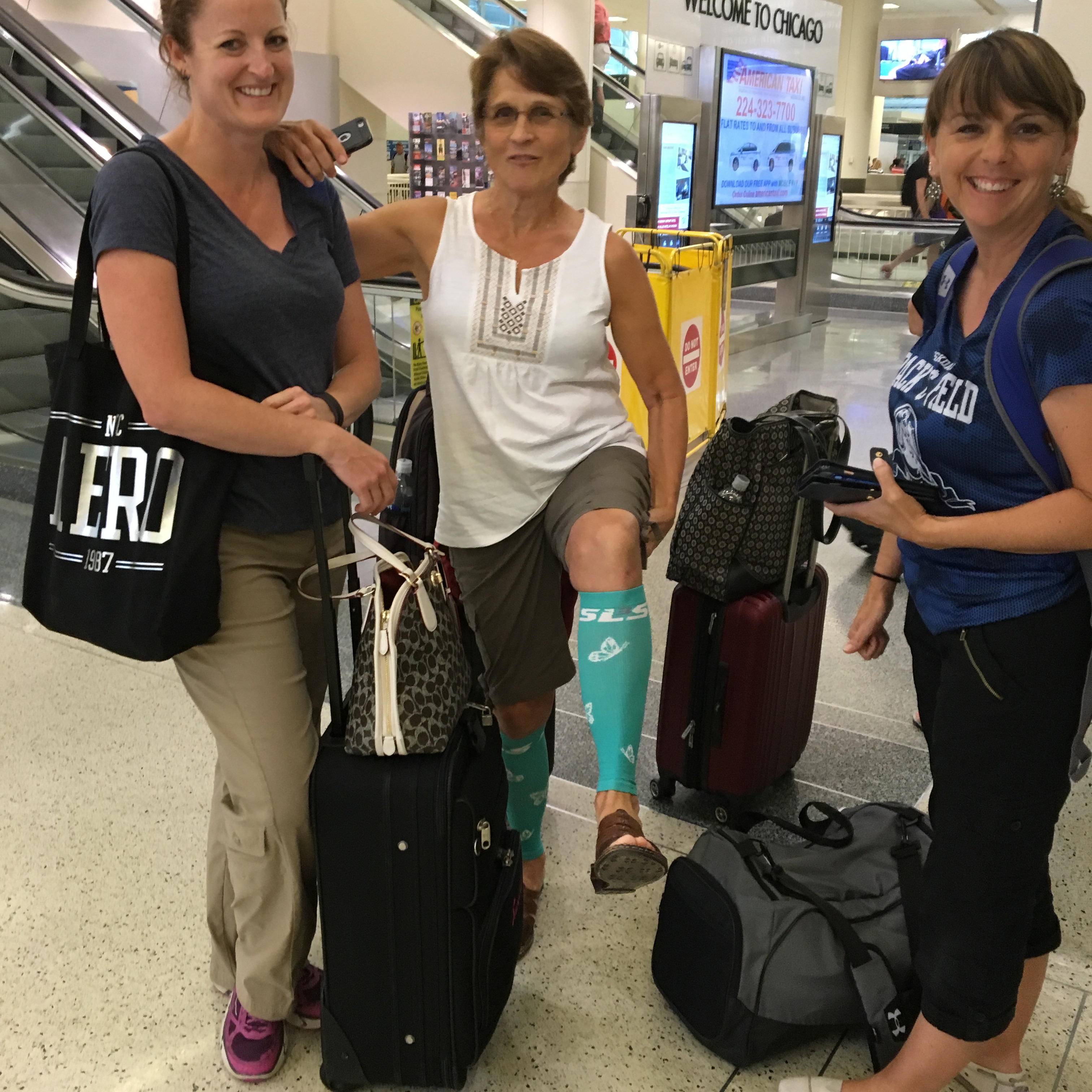 All flights took off without a hitch and we met at Chicago Midway as scheduled. We had a few minutes to wait for Melodie, and I amused (embarrassed) us all by modeling the latest in “protect your legs” gear.