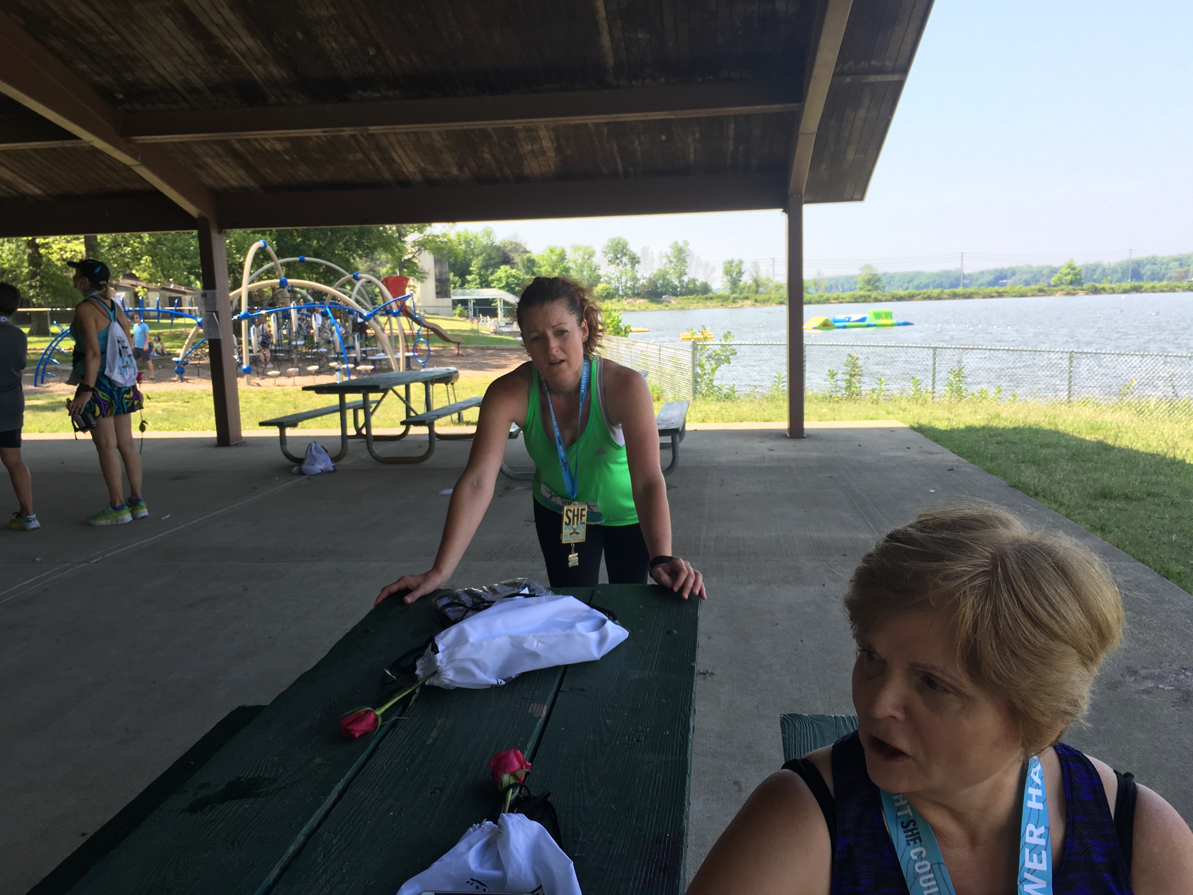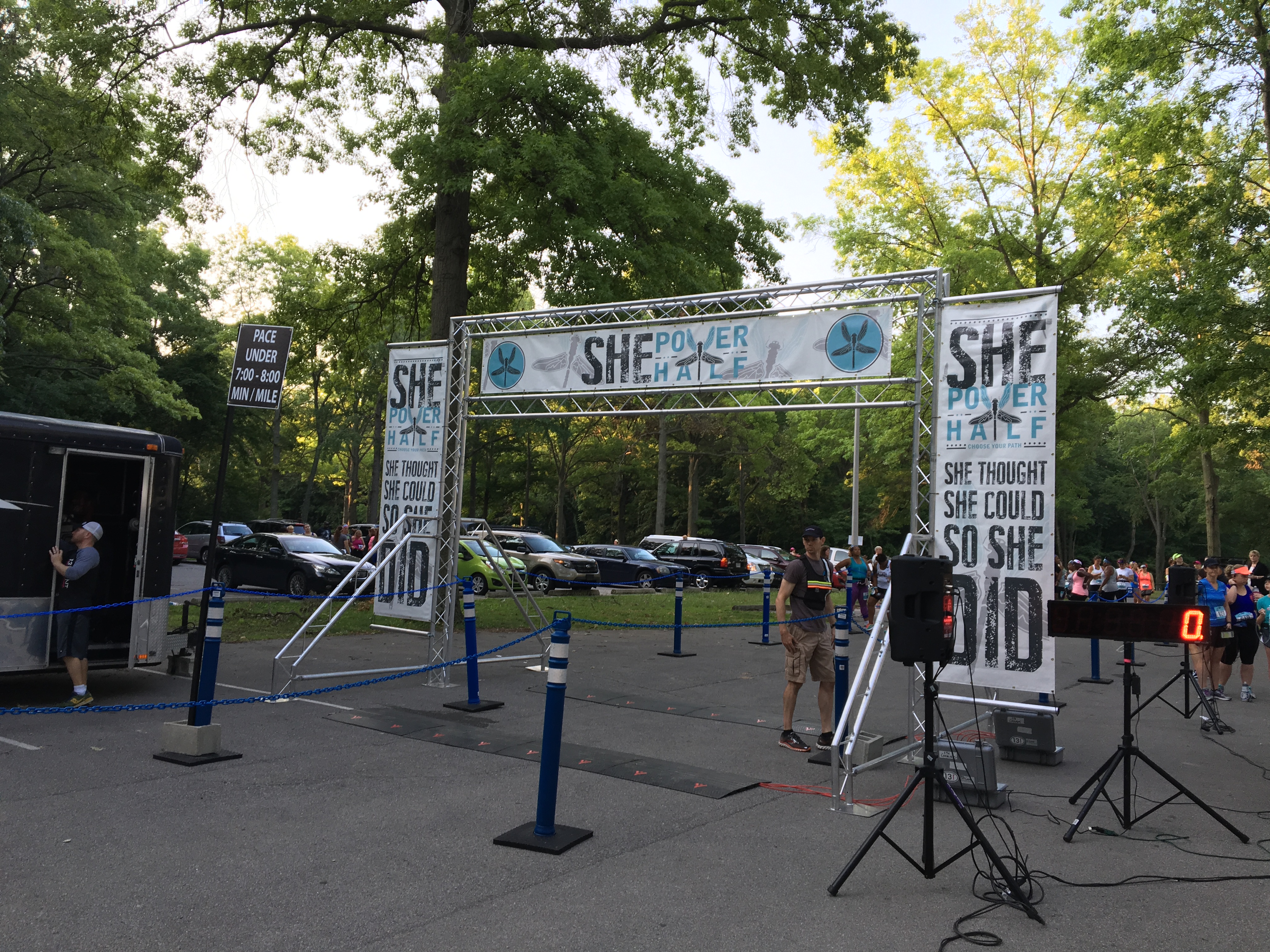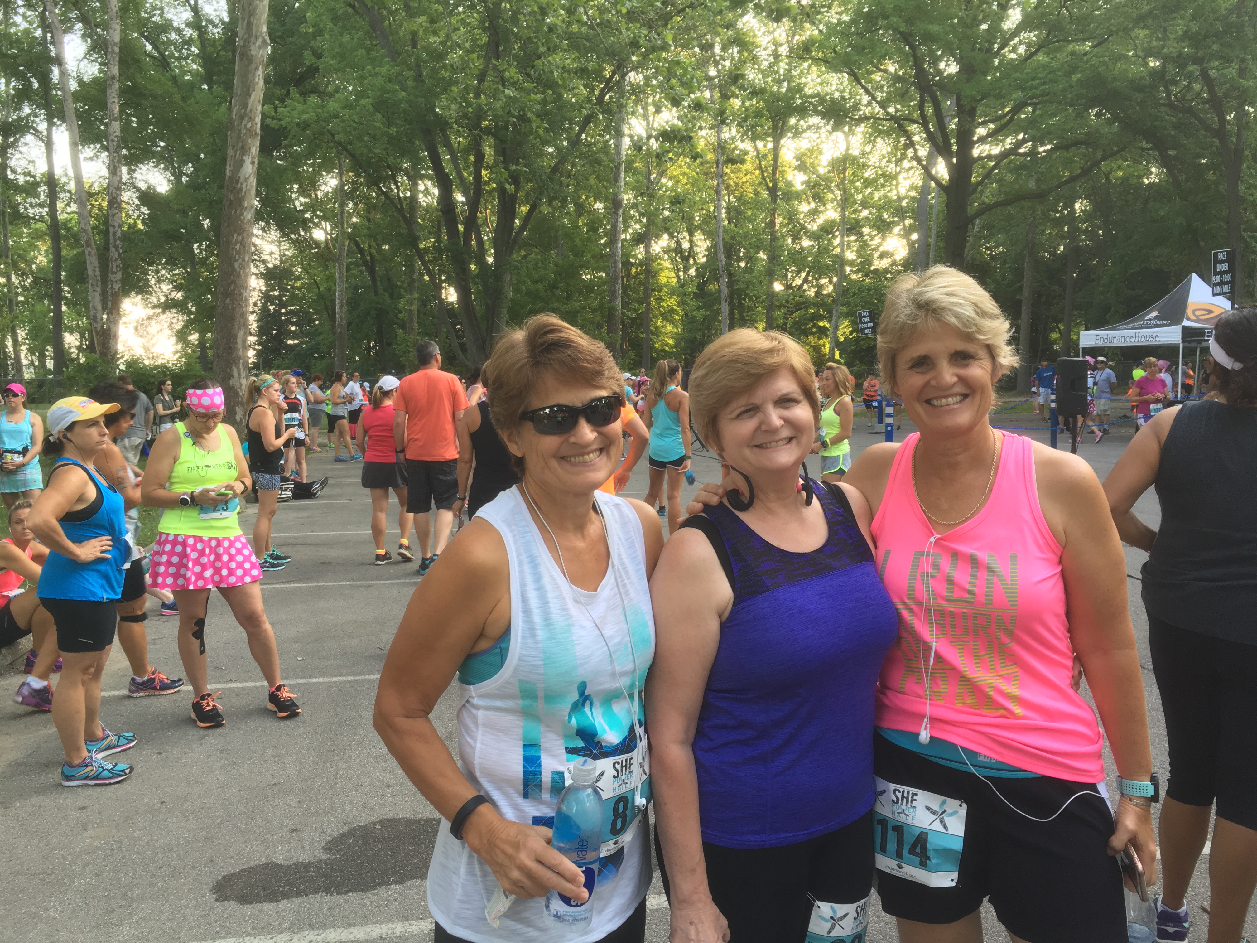The park was already filling up with cars when we arrived shortly after 6:30 am. Race preparations were well underway. The temperature was already 75 and the humidity registered 80. Yikes. We all decided to carry extra water.