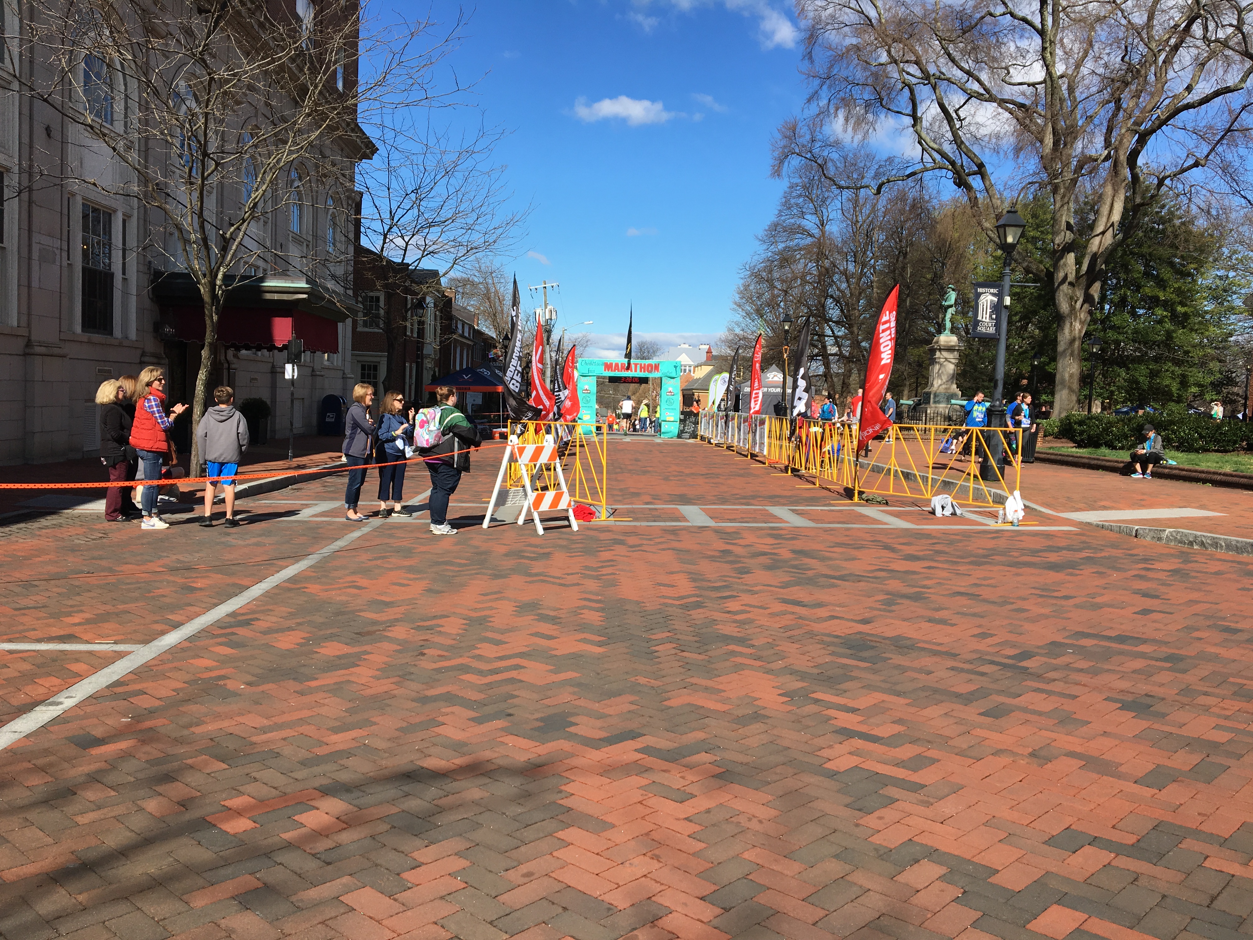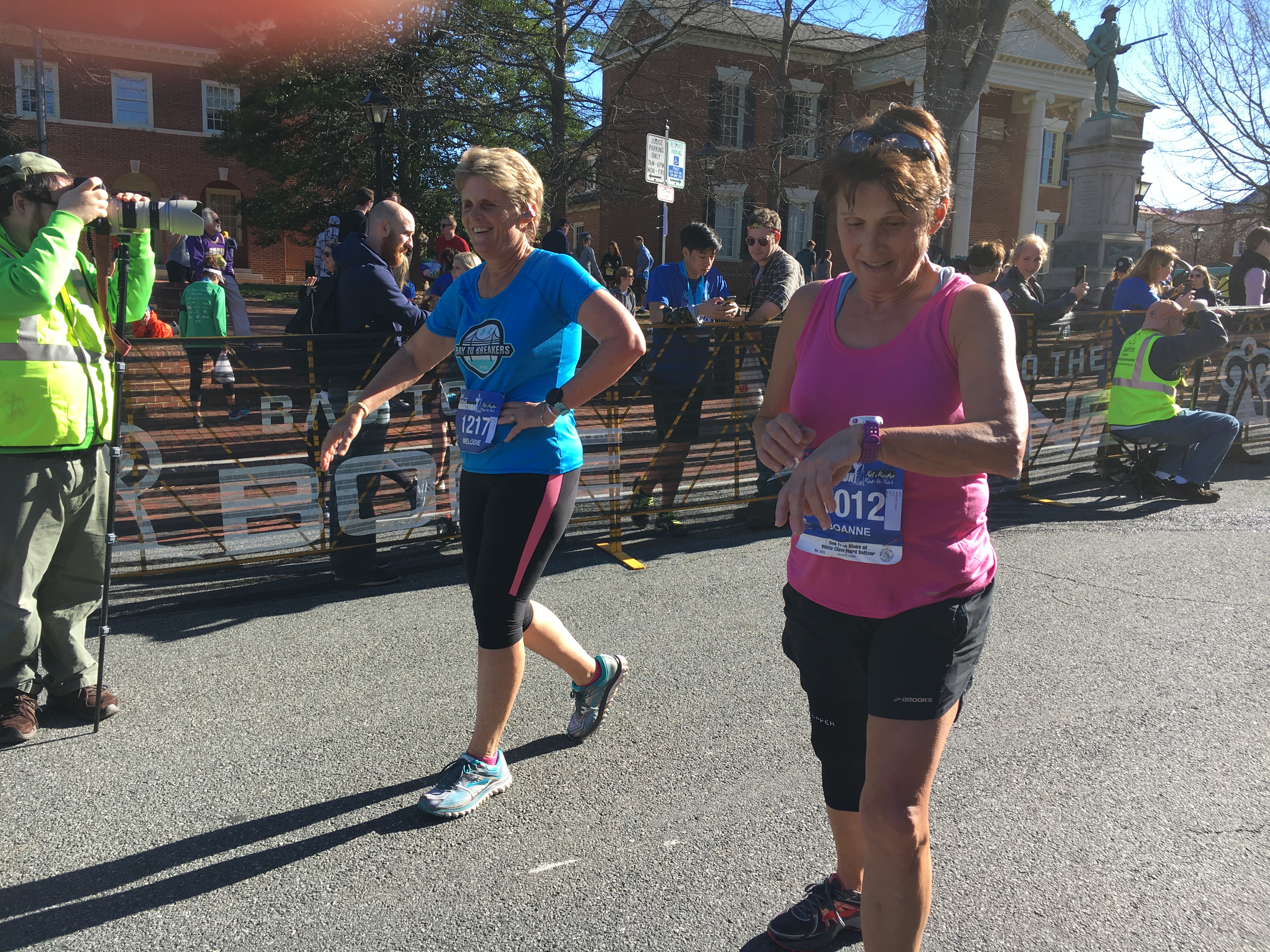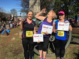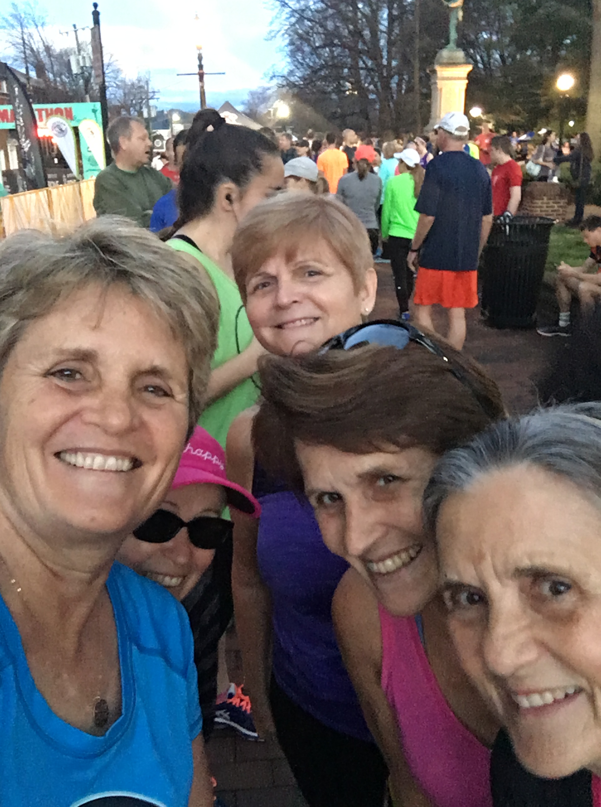We crawled out of bed the next morning at 5:30 am Eastern Daylight Time, which translates to 2:30 am at home! We pulled on our race togs, gulped down our race breakfast of coffee, cereal, and banana and headed down to the Historic Court Square for the race start. This was a relatively small race, 1,200 participants total, so the crowds were relatively manageable. Porta-potty lines were long, however, so we entertained ourselves by taking pictures.