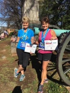 And once again, we were off. The course took us through the historic downtown area of Charlottesville, past the picturesque campus of University of Virginia, and then out to the Rivanna River Trail path. It was described as a hilly run, and we certainly found that to be true. Everything was either up or down for a total gain of 1,300 ft. over 13.45 miles. The 8K’ers had much the same terrain, just a little shorter. The weather, however, put its’ best foot forward and the temperature was perfect for running. Everyone finished in great spirits, no injuries, and as always, the best feeling of all is crossing that finish line and realizing you are done.