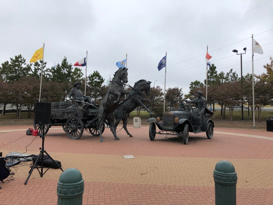 East Meets West Sculpture including 8 flags representing the 8 states that Route 66 crosses through.
